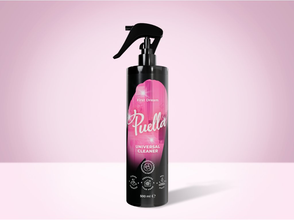 Wielofunkcyjny środek do czyszczenia w sprayu Puella o zapachu First Dream i zrównoważonym pH. Delikatnie, a zarazem skutecznie czyści wszystkie powierzchnie, usuwa kurz, smugi i odciski, a przy tym wypełnia Twój dom ulubionym zapachem.