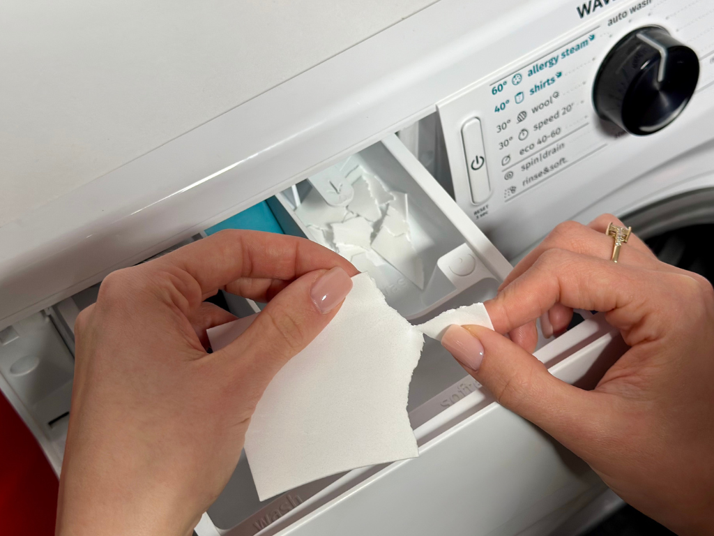 · Jeśli wybierzesz program prania z wstępnym namaczaniem, po prostu podrzyj listki na mniejsze kawałki, aby zmieściły się w przegródce na środki do prania w twojej pralce (zdjęcie nr 1).